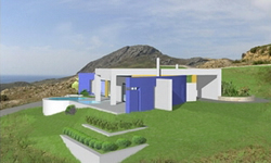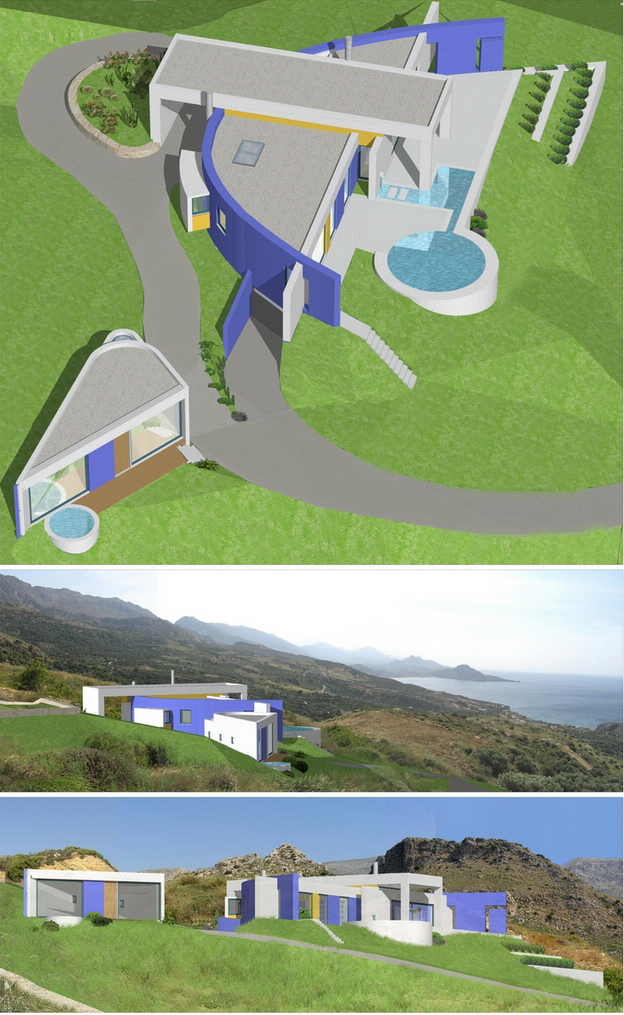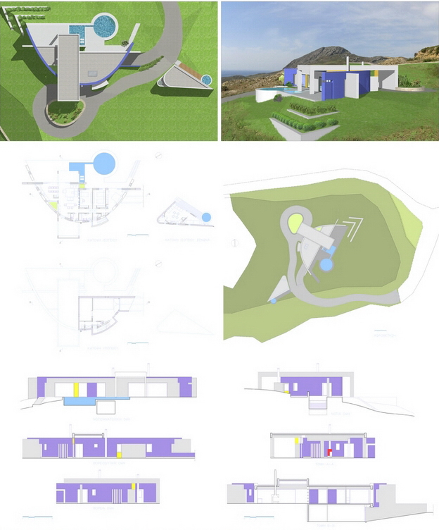 Η ισόγεια κατοικία μελετήθηκε με κριτήρια βιοκλιματικού σχεδιασμού ως «άρθρωση» ενός καμπύλου τοίχου και ενός παραλληλεπίπεδου.
