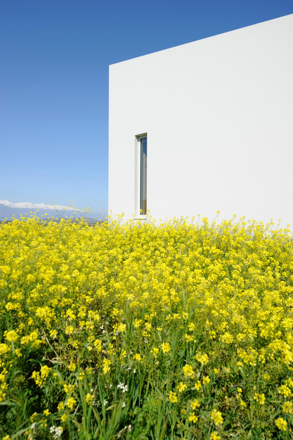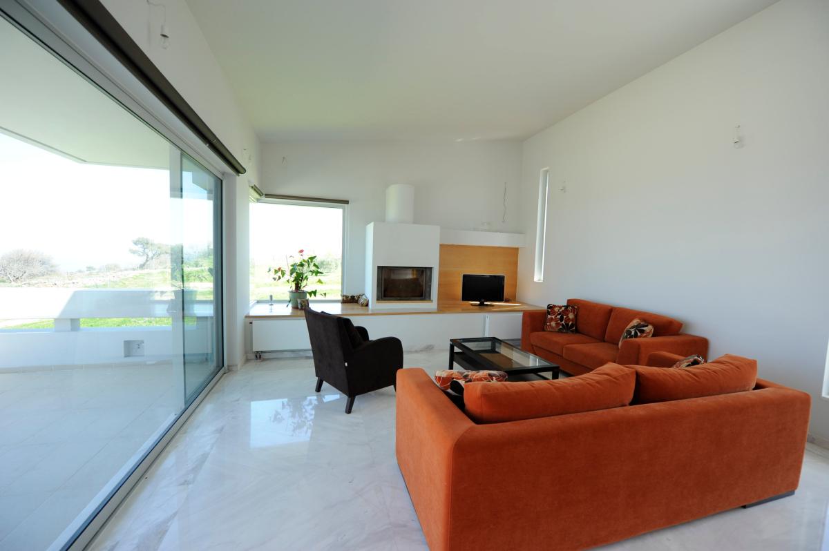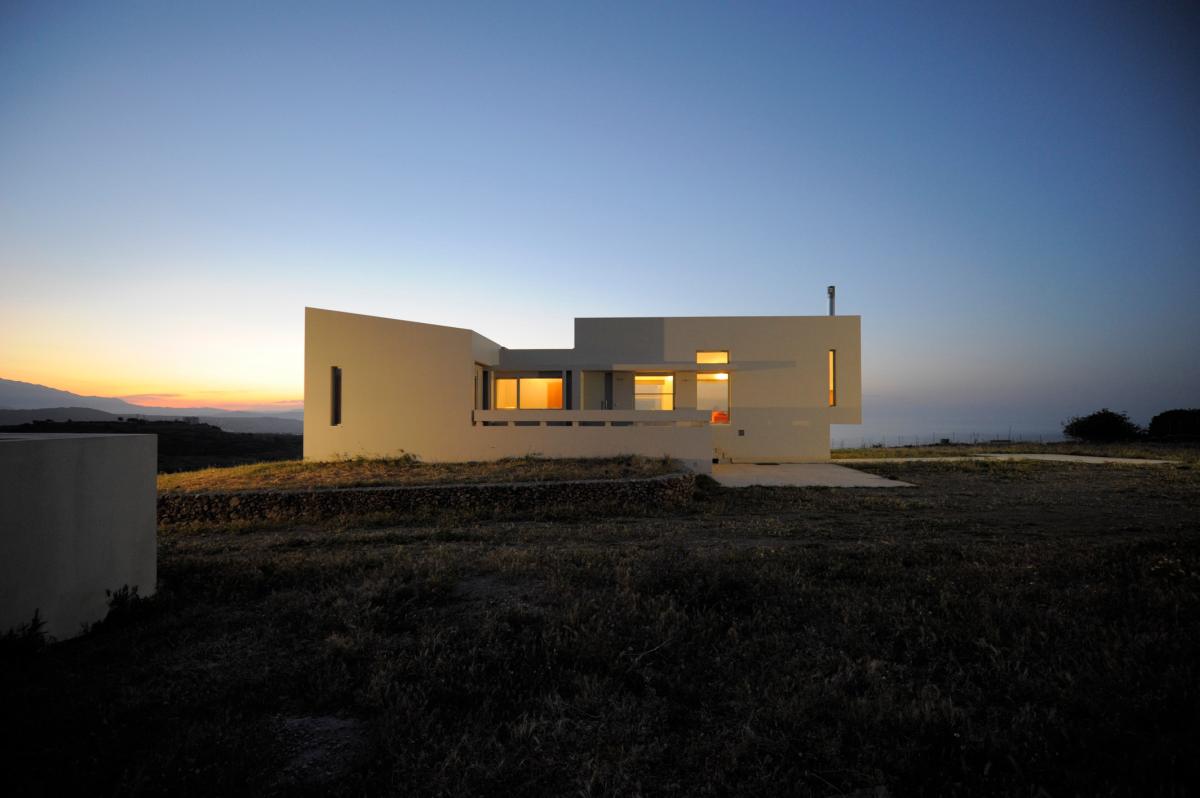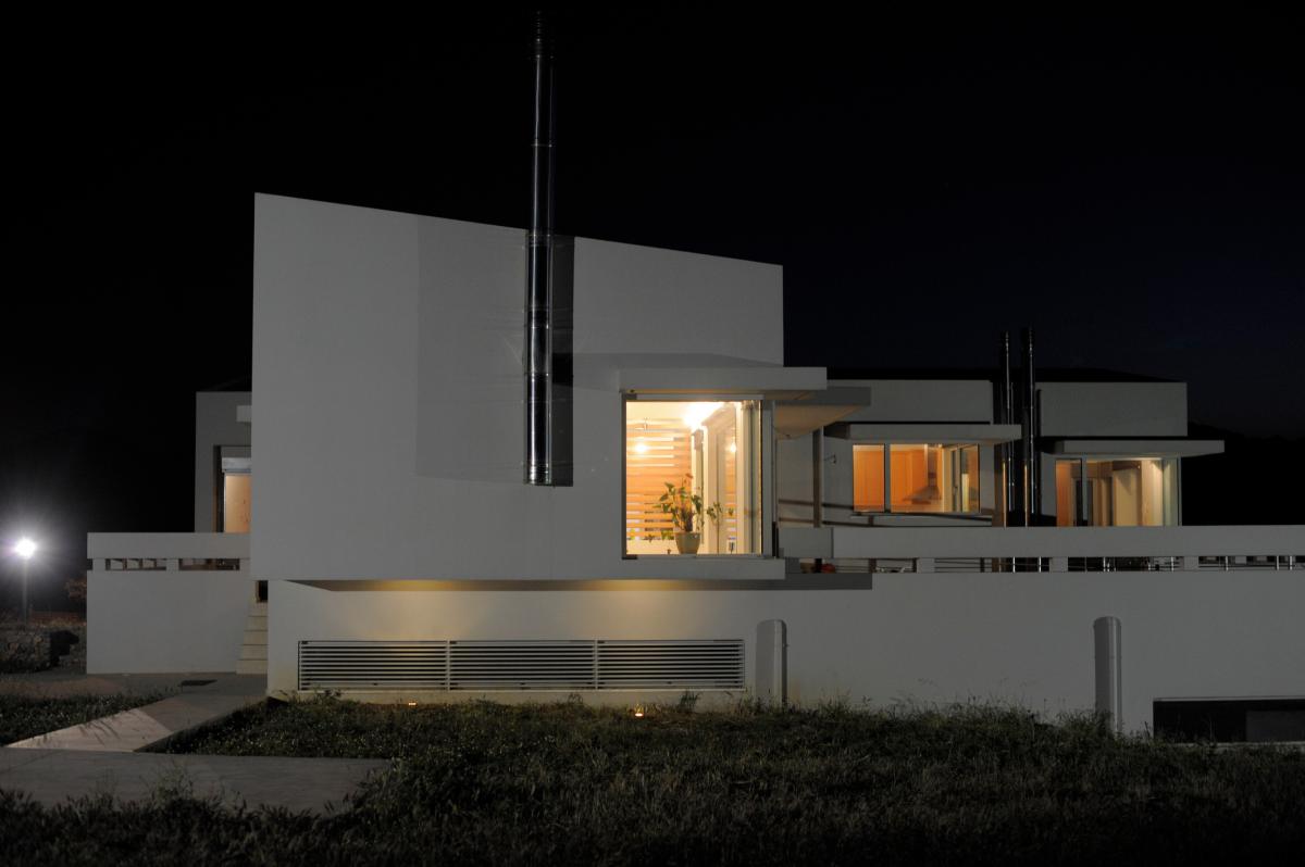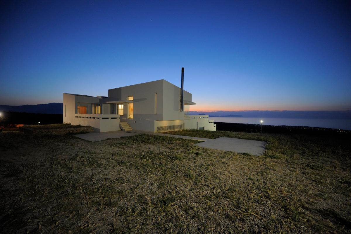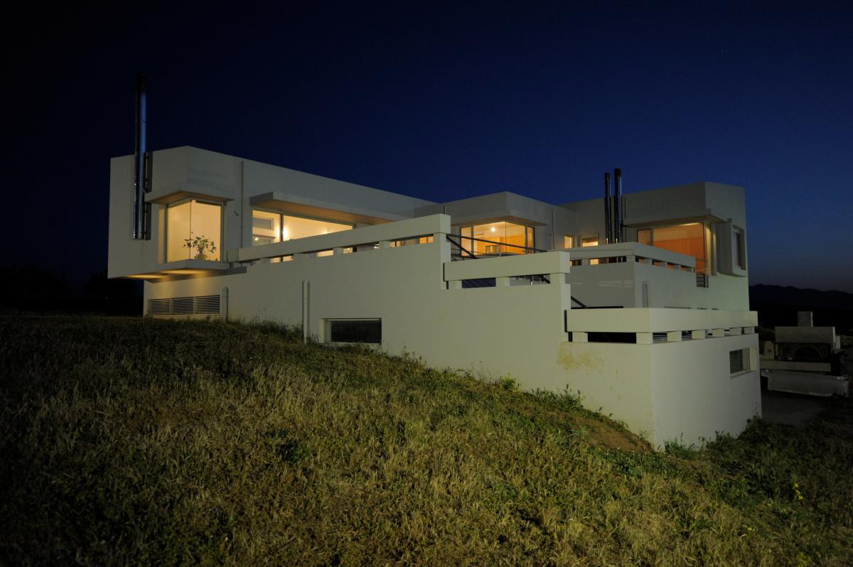 Μια μεγάλη βεράντα χαρίζει άπλετη θέα κυρίως νοτιοανατολικά. Τα μεγάλα ανοίγματα , η διάσπαση των όγκων και η λιτή χρήση του χρώματος χαρακτηρίζουν όλο το έργο.